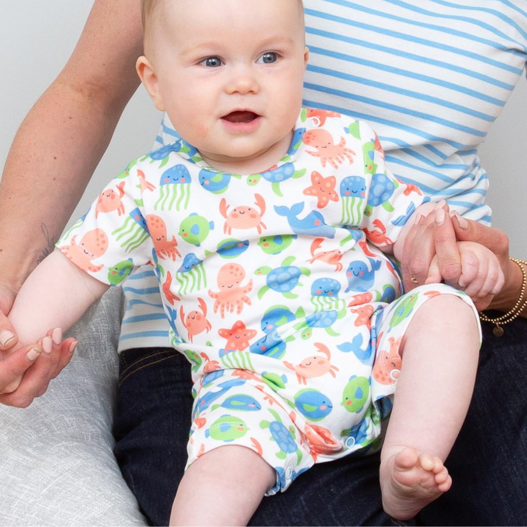 Made from soft and gentle organic cotton that’s kind on delicate skin, this Kite romper, in their cute Under The Sea all-over print, makes the cutest romper outfit for your little one. Designed for sleepy time and playtime, this option offers comfort day and night.