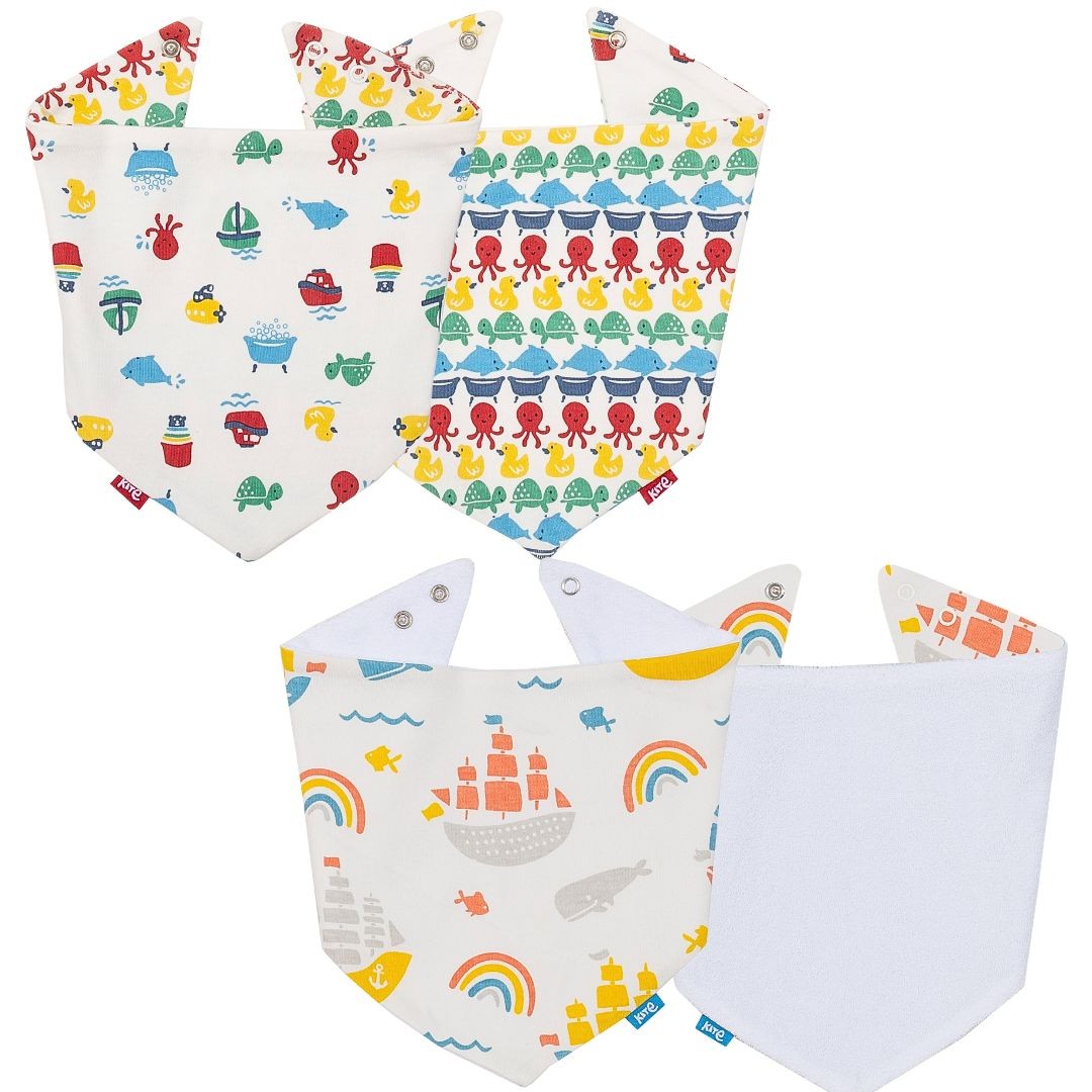 You can’t go wrong with this fun two pack of reversible organic bibs. Made in GOTS certified organic cotton, each one has a unique print and design. One bib is printed on both sides, with a colourful all over print full of sea creatures in an interlock fabric on one side, and a lovely cream colour with sea life dotted all over it on the reverse side. The second bib has a ships and rainbows print on one side and a soft cream towelling on the other side. A super useful little accessory which helps to protect both clothes and your little one’s skin.